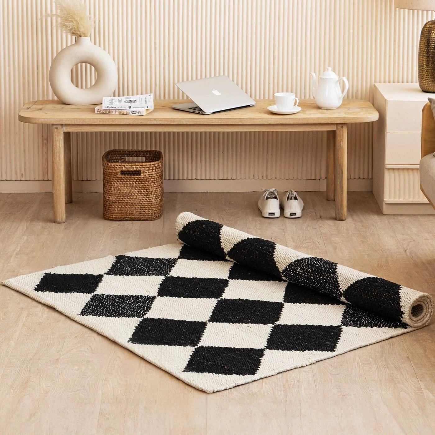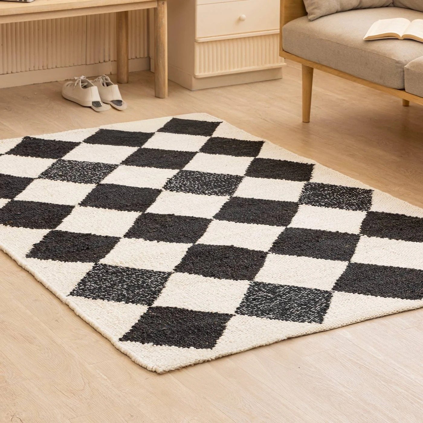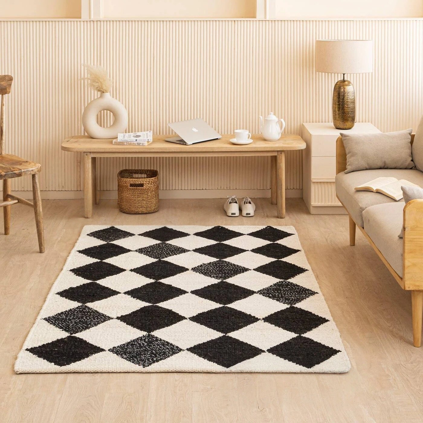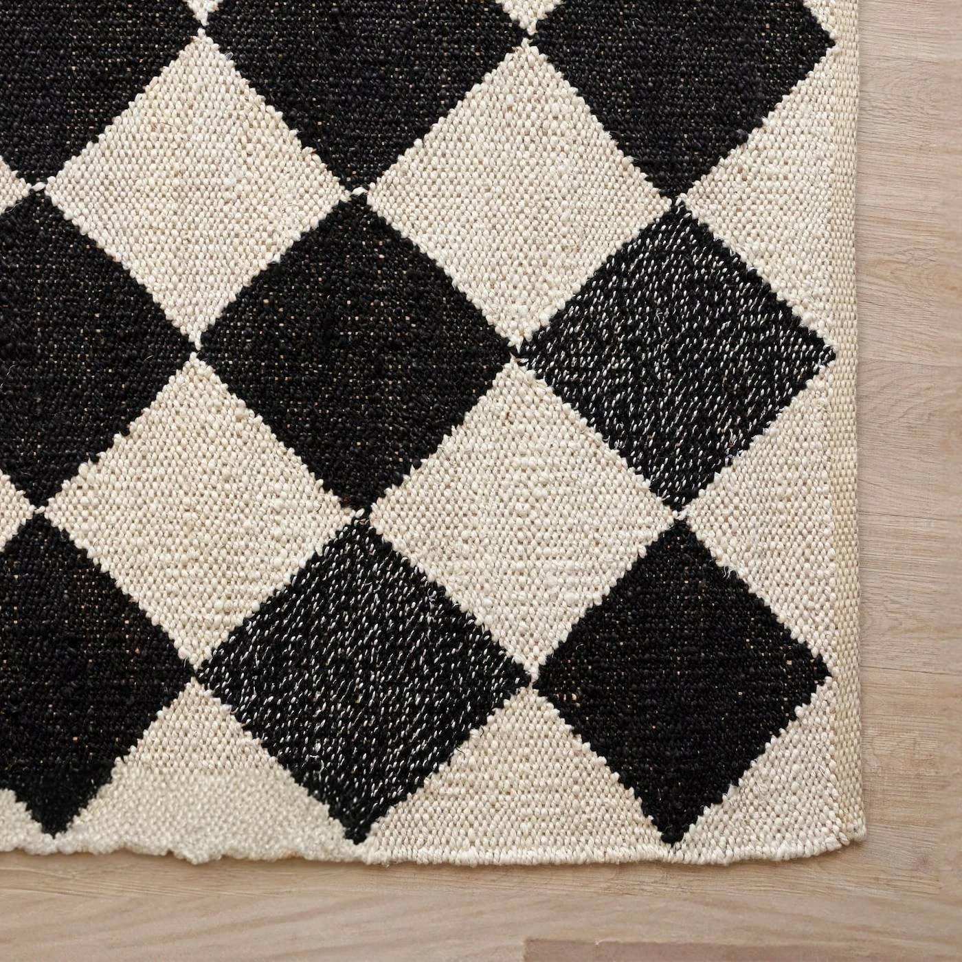 Podnieś swoją przestrzeń dzięki wyjątkowemu urokowi tego czarnego jutowego dywanu w kratę harlequin