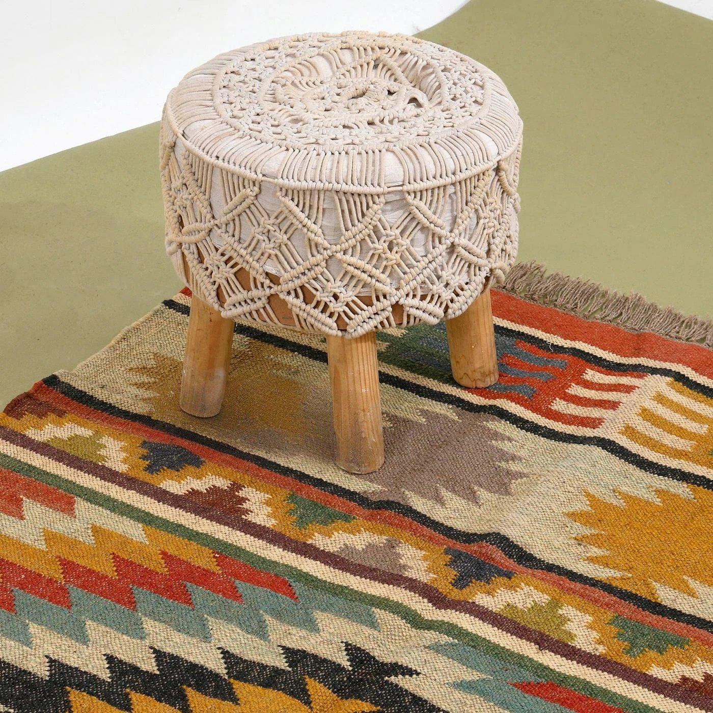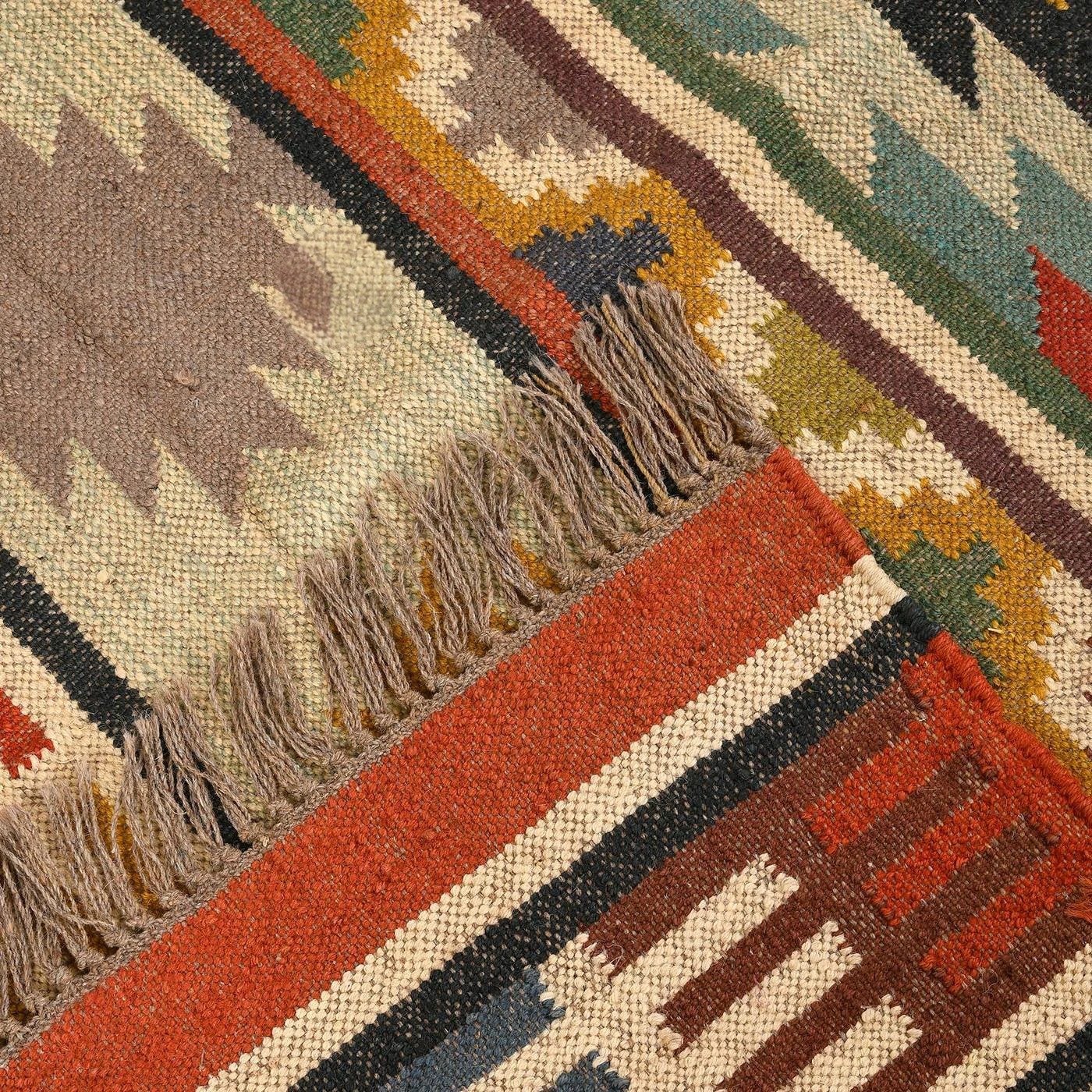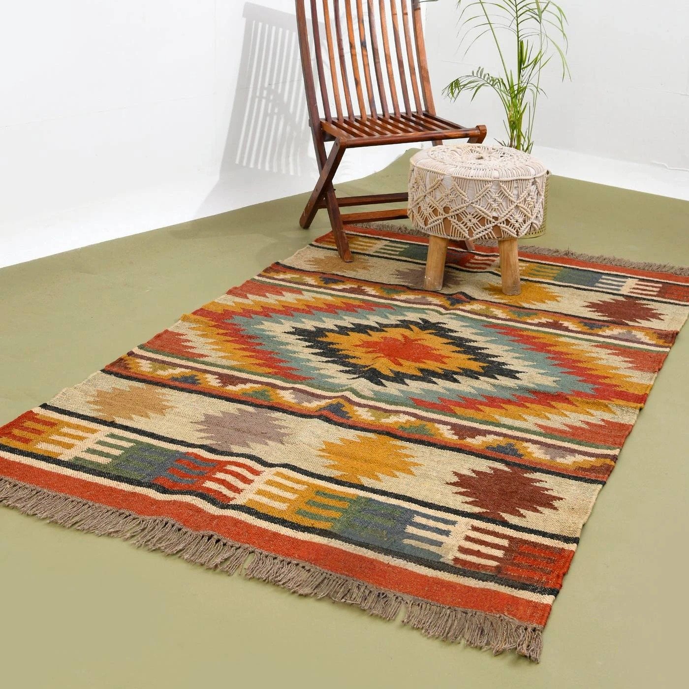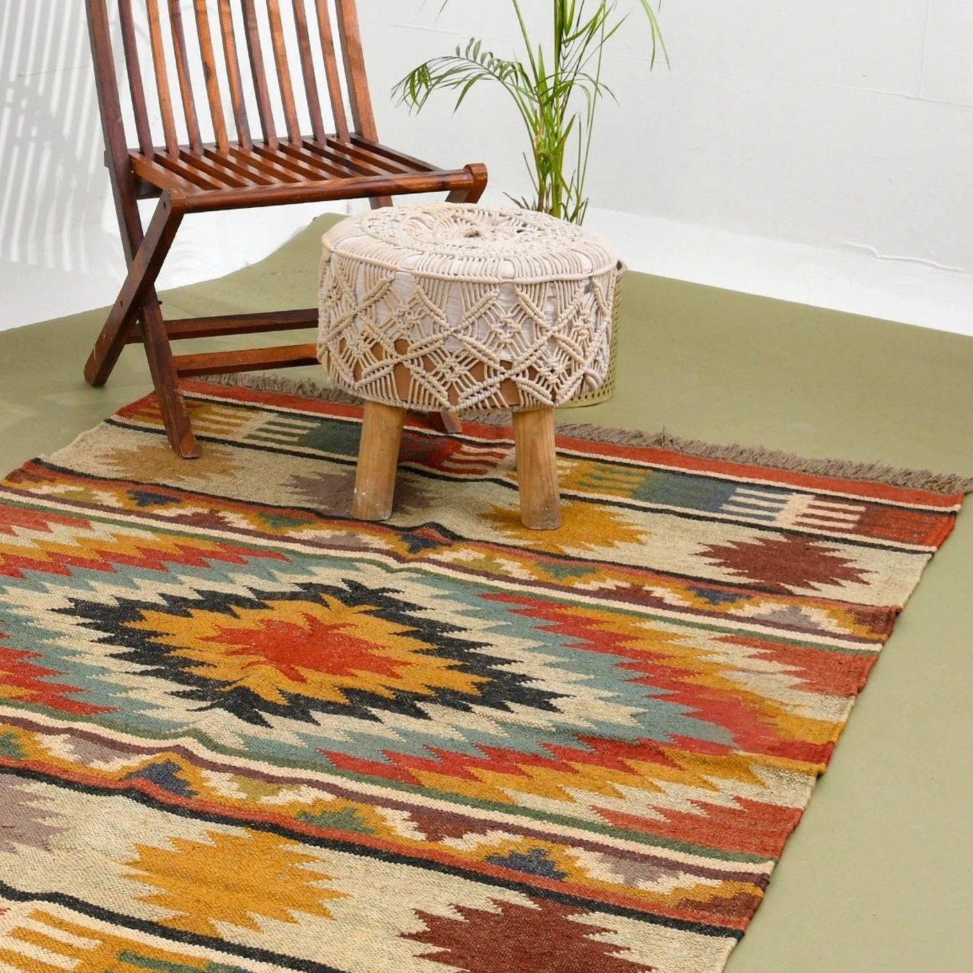 Odmień swoją przestrzeń dzięki żywym kolorom i dziedzictwu kulturowemu, korzystając z tego wielokolorowego, południowo-zachodniego dywanu jutowego kilim